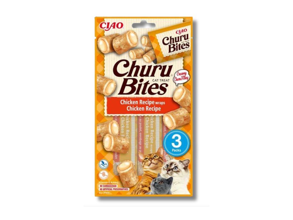 Churu Bites jsou šťavnaté, krémové a extra lahodné pamlsky ve tvaru polštářků s kuřetem z farmářského chovu plněné masovým pyré z kuřete.