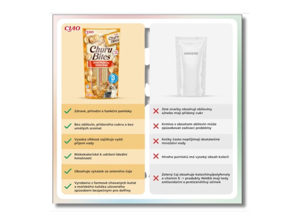 Churu Bites jsou šťavnaté, krémové a extra lahodné pamlsky ve tvaru polštářků s kuřetem z farmářského chovu plněné masovým pyré z divokého tuňáka a lososa.