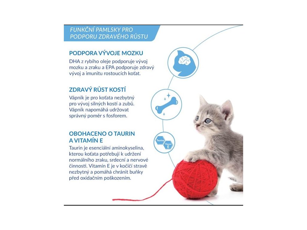 Lízací pasta obsahuje vápník nezbytný pro vývoj silných kostí a zubů. DHA z rybího oleje podporuje vývoj mozku a zraku a EPA podporuje zdravý vývoj a imunitu rostoucích koťat. Pamlsky jsou obohacené taurinem, který kočky potřebují k udržení zdravého zraku, správné funkce nervů a silného imunitního systému, a vitamínem E, který pomáhá chránit buňky před oxidačním poškozením. Díky vysokému obsahu vody přispívají pamlsky k hydrataci organismu a k prevenci potíží močového ústrojí. Jsou nízkokalorické, bez obilovin (grain-free), konzervačních látek a umělých barviv. Čerstvé maso kuřat chovaných na farmách poskytuje vysoce kvalitní bílkoviny.