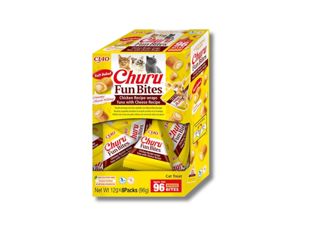 Lahodné pamlsky Churu Fun Bites ve tvaru polštářků s jemnou krémovou náplní kombinují měkkou texturu s neodolatelnou chutí.