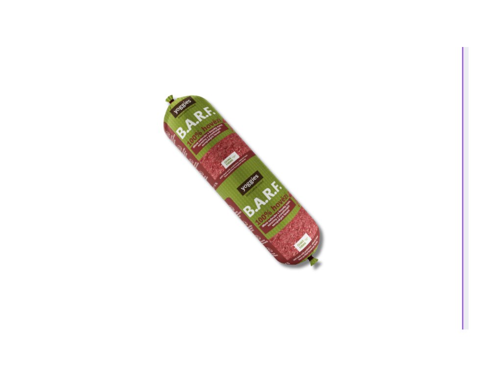 Menu obsahuje syrové hovězí maso, vnitřnosti (srdce, játra, plíce), chrupavky a šlachy, kloubní výživa, probiotika pro podporu zdraví a imunity. Menu 100% hovězí je mleté nahrubo, a proto je vhodné pro všechny věkové kategorie psů, včetně štěňat od 30. dne života. Hovězí maso má vyšší obsah kvalitních bílkovin a nižší obsah tuku. Obsahuje vitamíny řady „A“ a „B“ a množství minerálů jako je železo, zinek, draslík, hořčík a vápník. Hovězí menu je jako monoproteinové dobře stravitelné. Toto menu může být vhodné pro široké spektrum alergických psů i při různých dietách a snižování cholesterolu. V případě podávání masa 100% hovězí nezapomeňte doplnit krmnou dávku o Yoggies Vápník z řas (Lithotamnium). Toto menu obsahuje pouze kvalitní svalovinu a vnitřnosti v potravinářské kvalitě, neobsahuje kosti.