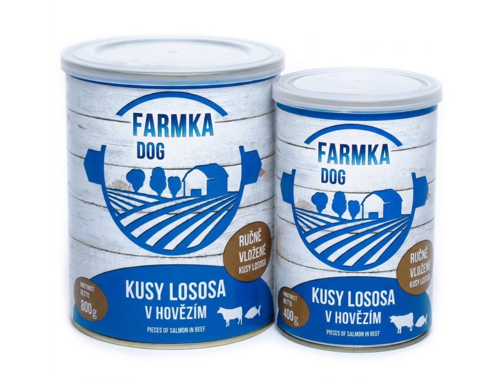 Daruj svému pejskovi přirozenou masovou radost s dotekem mořské chuti! FARMKA DOG s lososem 800 g je poctivá česká konzerva, která kombinuje ručně vložené kousky lososa s kvalitním hovězím masem a droby — výživná a chutná volba pro každého čtyřnohého parťáka.