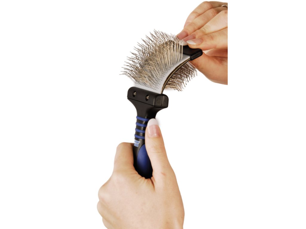 Drátkový Flexi kartáč pro psy padne výborně do ruky. Pogumovaná rukojeť neklouže ani při namočení. Kartáč je lehký a šetří tak ruku při pravidelném česání. Hlava kartáče je pružná a díky tomu se dokonale přizpůsobí tělu psa a při česání se bez problémů dostanete i do míst hůře dostupných, jako je například podpaží. Unikátní provedení nabízí z každé strany jinou tvrdost podložky. Tento kartáč vám tak pomůže rozčesat zacuchanou srst (strana s tmavou podložkou), tak i šetrně pročesat i již rozčesanou srst (strana se světlou podložkou) bez toho, aby chlupy přelámal. Pevnost drátků je ideální i pro česání husté, kadeřavé srsti. Je šetrný k dlouhé srsti a často se používá i při úpravě výstavních pudlů. Tento kartáč je velmi oblíbený v psích salonech. Srst doporučujeme česat po vrstvách za použití rozčesávacího spreje a rozčesání kontrolovat jednořadým hřebenem. Tento kartáč doporučujeme například na plemena jako pudl, bišon, havanský psík, maltézáček, kokršpaněl. Kartáč je k dostání ve dvou velikostech. Flexi kartáč malý rozměry: hmotnost: 76 g, celková délka: 20 cm, velikost pracovní části: 5 x 5 cm, délka rukojeti: 11 cm, délka drátků: 2 cm, podložka: tvrdá. *Všechny údaje jsou přibližné.