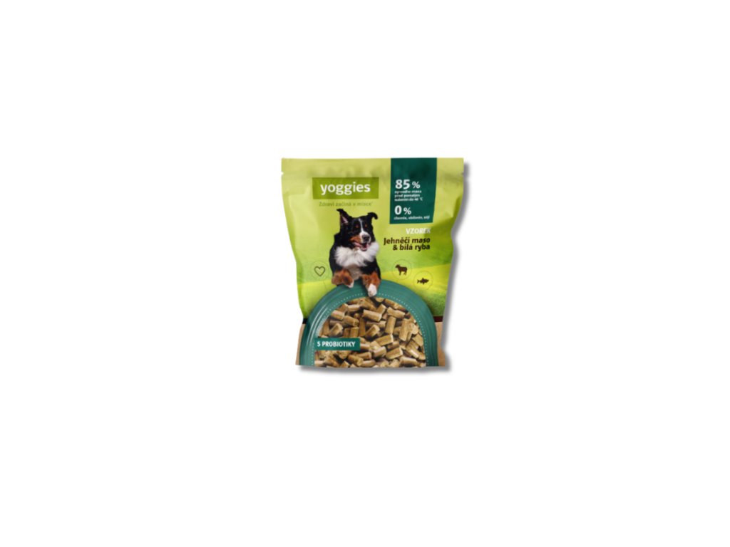 90g Yoggies Vzorek jehněčí maso&bílá ryba, granule lisované za studena s probiotiky