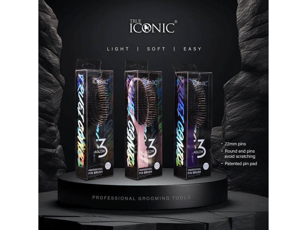 Profesionální kartáč True Iconic Aglow Pin Brush 🐾 s jemnými nerezovými hroty a měkkou poduškou pro šetrné česání psů a koček. Ergonomická rukojeť, bezpečný design a ekologické balení ♻️.