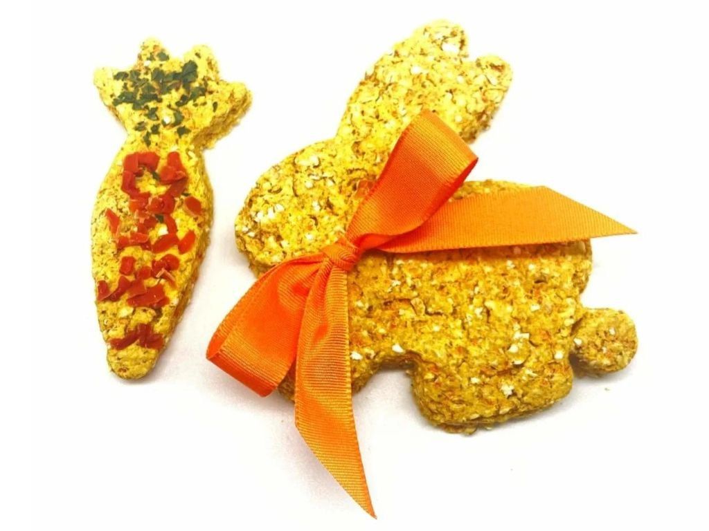 Pojďme si užít Velikonoce! Velikonoční zajíček je upečen z krůtího masa, mrkve, ovesných vloček a kurkumy, a je ozdoben mašlí. Každý zajíček váží přibližně 40 g a je zabalen v celofánu spolu s upečenou mrkvičkou.